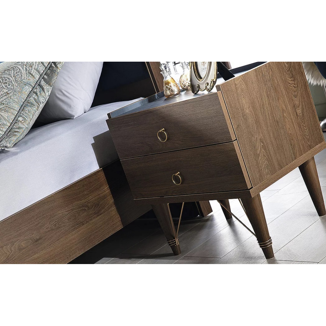Прикроватная тумба Пальма PALMA-27 от Беллона  выполнена в соверменном дизайне, котрый подчеркнут оригинальным рисунком пленки на фасаде дверей и ящиков, ручками золотистого цвета, высокими ножками с металлическим декором золотистого цвета.   Благодаря стильному, эффектному оформлению модель придаст дополнительный лоск интерьеру. Купить прикроватную тумбу к спальной зоне рекомендуется в количестве 2 шт, для симметричного расположения по бокам кровати. При ограниченном пространстве можно ограничиться одной.