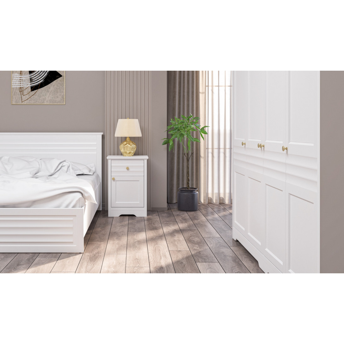 Денвер – это новая коллекция корпусной мебели для спальни, гостиной и столовой. Прямые строгие линии в сочетании с легкой горизонтальной волной на фасадах придают мебели элегантный и уверенный вид. Белый матовый цвет мебели, любимый многими за универсальность, можно сочетать с любым оттенком стен и пола. Округлые металлические золотые ручки разбавляют строгий и лаконичный вид фасадов и добавляют интерьеру утонченности.