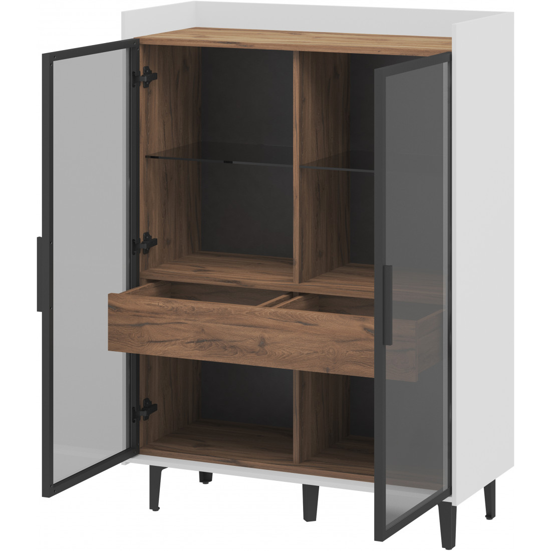 Компактный шкаф Модена представляет уникальное решение для небольших гостиных. Выберите из трех стильных вариантов цветов: Белый-Дуб Элисон, Лунный камень-жемчуг, Металл Бруклин-лунный жемчуг. Металлические ножки гармонично дополняют дизайн, обеспечивая стабильность. Темное стекло придает шкафу загадочность. Два отделения с элегантными стеклянными полками и фасадами создают легкость и визуальное пространство, а между ними расположен удобный ящик для хранения мелочей. Шкаф Модена — идеальное решение для организации пространства в небольших гостиных с учетом стиля и функциональности