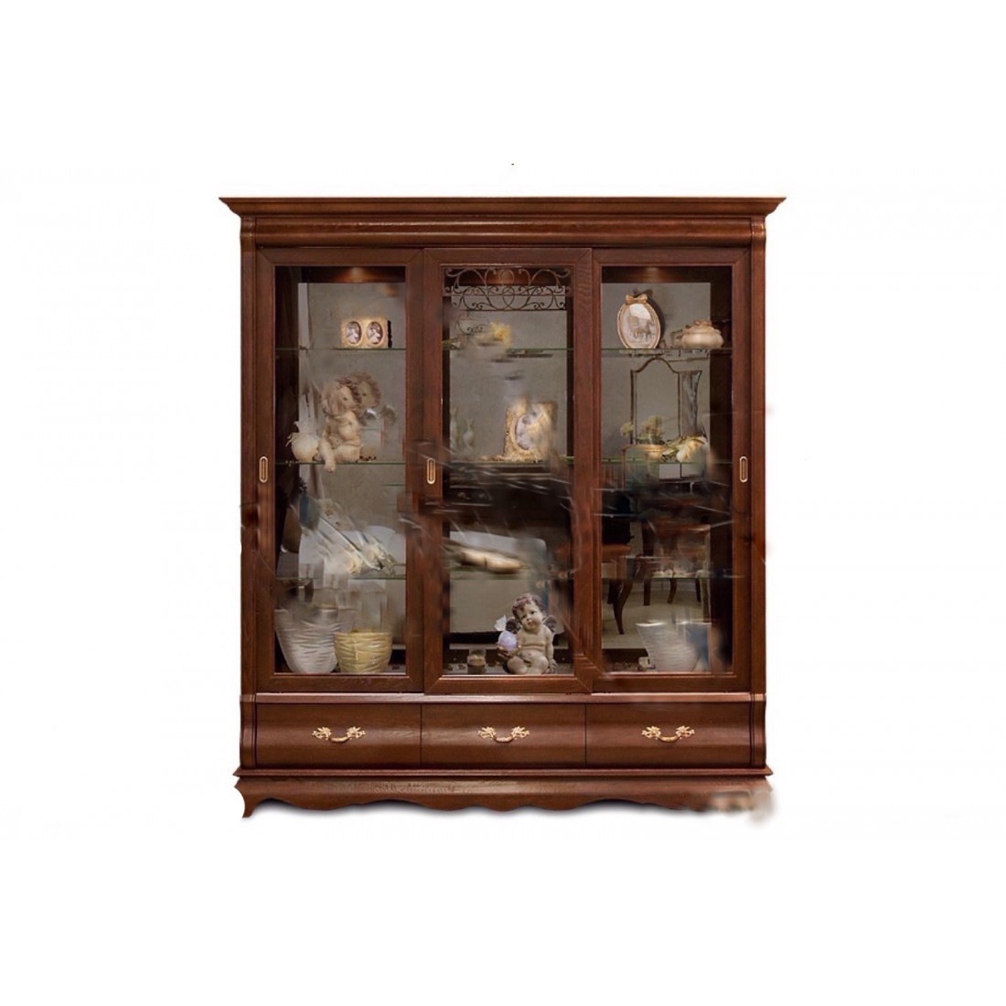 Классический трехдверный шкаф со стеклянными витринами из коллекции мебели "Оскар" это гармония изогнутых форм и стекла. Стеклянные дверцы с фацетом декорированы ажурной резьбой с растительным орнаментом. Фасад выполнен из массива дуба. Модель окрашена в оттенок "Орех"