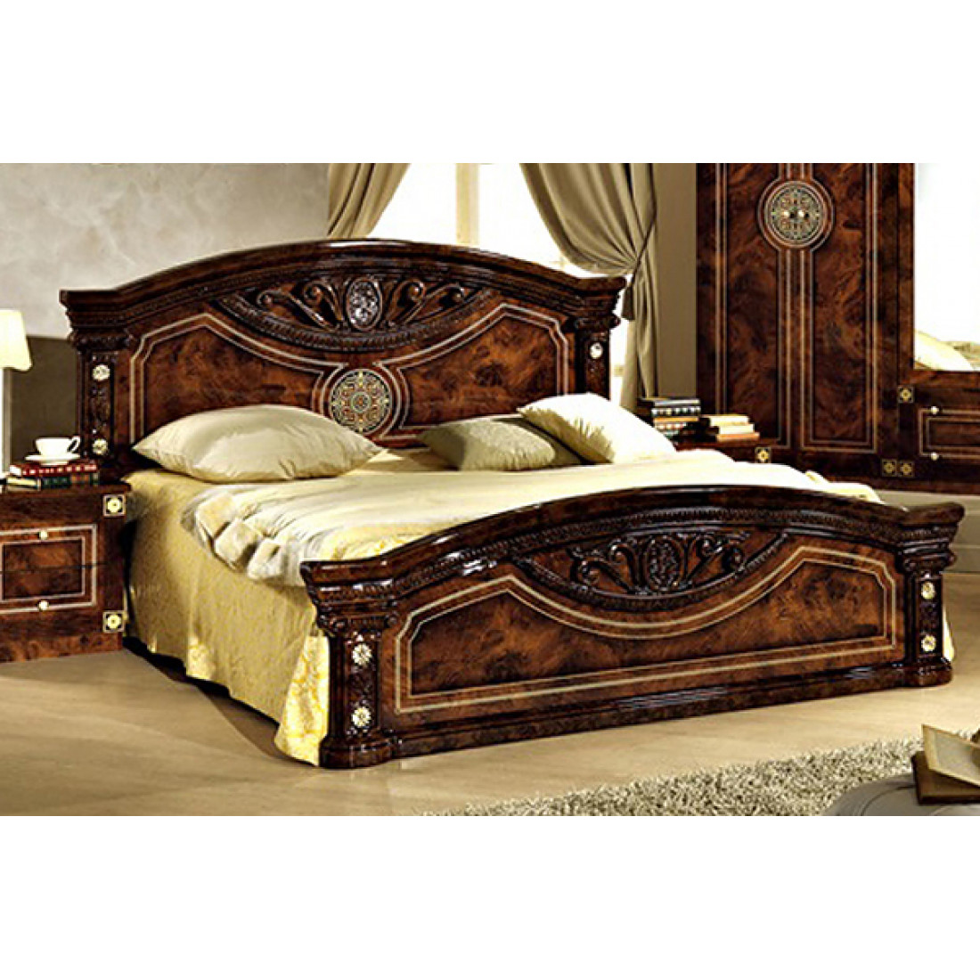 Спальня Рома (орех) композиция 2 от Российской фабрики «ДИА мебель» выполнена в строгом, классическом стиле. Ореховый цвет в сочетании с глянцевым покрытием придает элегантность. Такая спальня поможет Вам окунуться в атмосферу роскоши и комфорта. Большой шестистворчатый шкаф поможет с пользой заполнить место. Безшумные и плавно закрывающиеся дверцы шкафа и комода помогут с легкостью забыть о шуме по утрам. Вся коллекция "Рома" предназначена только для истинных ценителей элегантного классического стиля.
