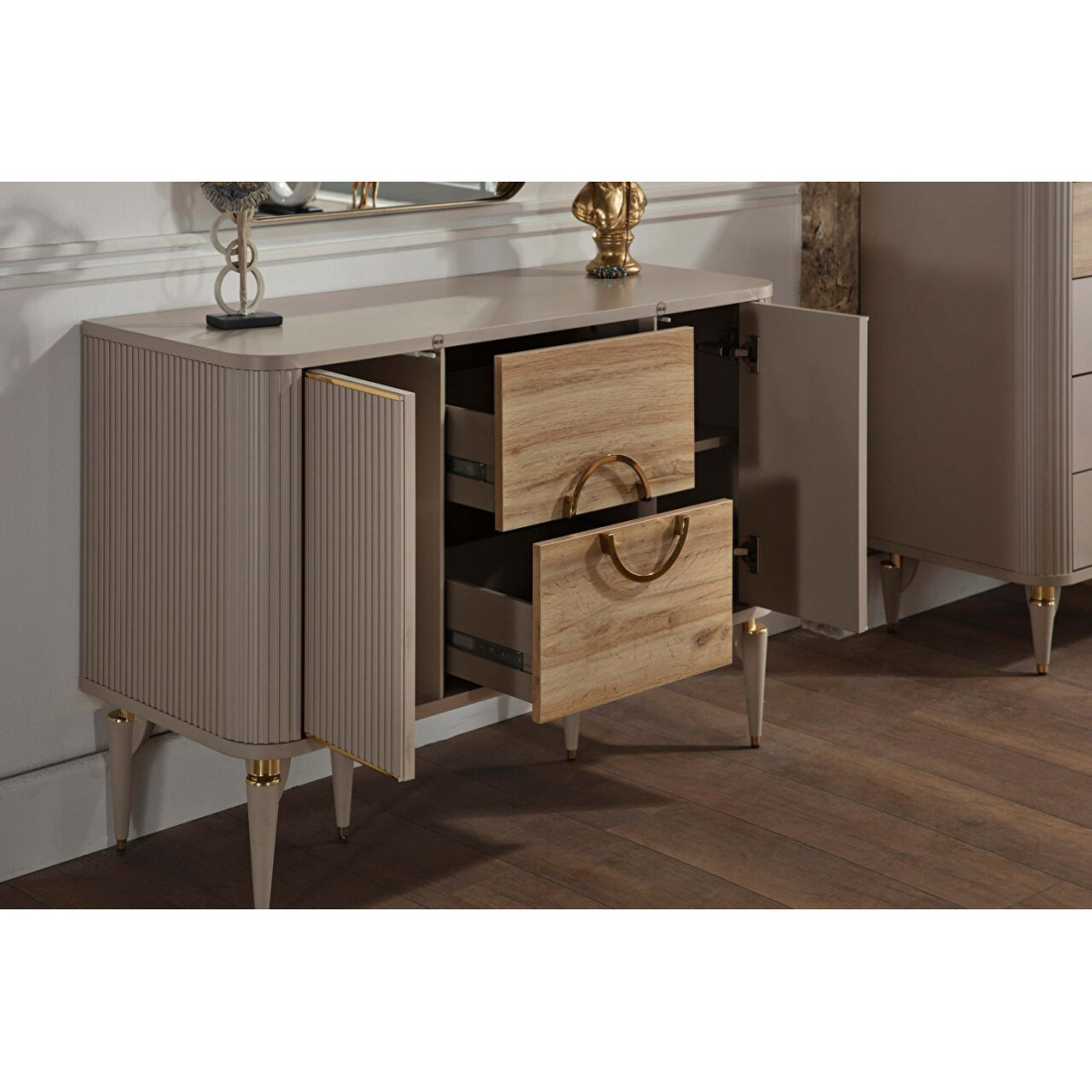 Туалетный столик Санвито SANV-23 один из элементов турецкой коллекции SANVITO. Прекрасное дополнение интерьера спальни, гостиной, залы. Столик обладает сравнительно небольшими размерами 1,170 мм x 470 мм x 830 мм. Может использоваться как дамский столик или как комод. Имеет два больших вместительных выдвижных ящика по центру, и полки для хранения за дверцами фасадов. Кремовый оттенок фасадов, наряду с рифленой  поверхностью комбинируется с древесной фактурой ящичков. Оригинальный дизайн и теплые, нежные тона в сочетании с функциональностью столика-комода Санвито SANV-23 делают его изящным и привлекательным.